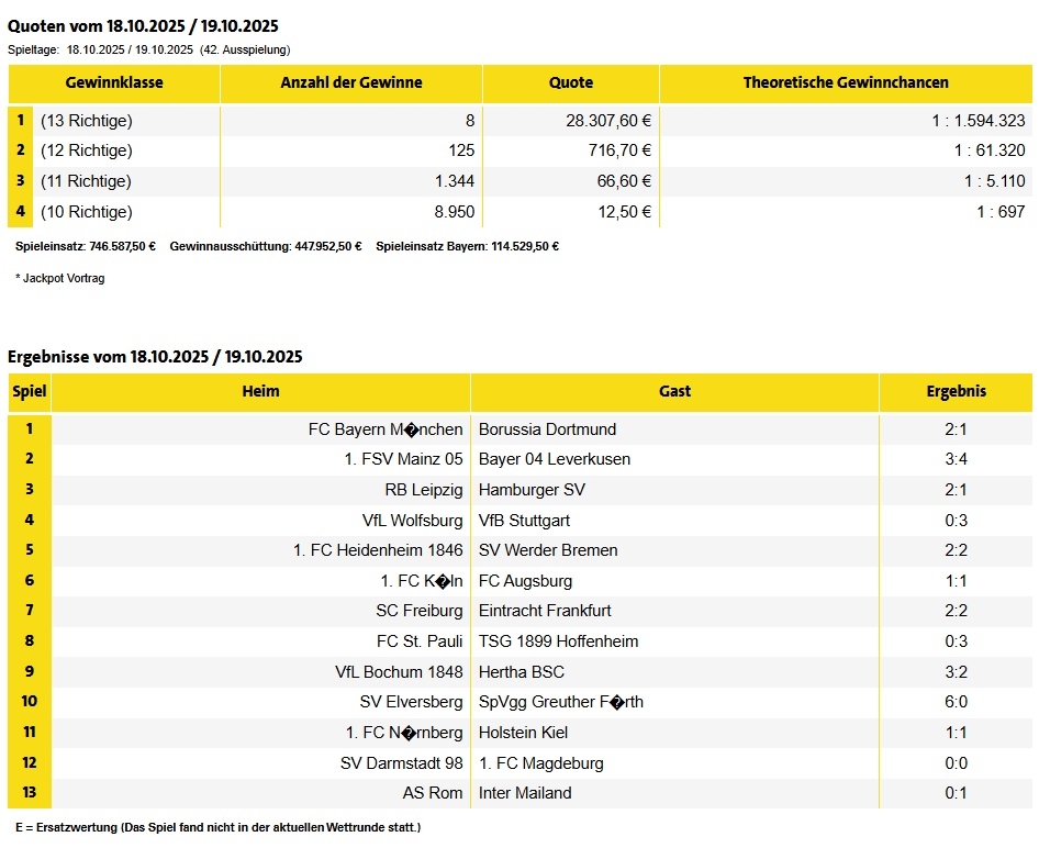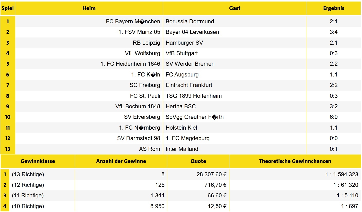 Almanya da Spor Toto sonuçları arkadaşlar merak edenler için paylaşıyorum. 13 maç üzerinden sadece son maç farklı bir ülkeden yazılıyor. Spieleinsatz: 746.587,50 € (toplanan)