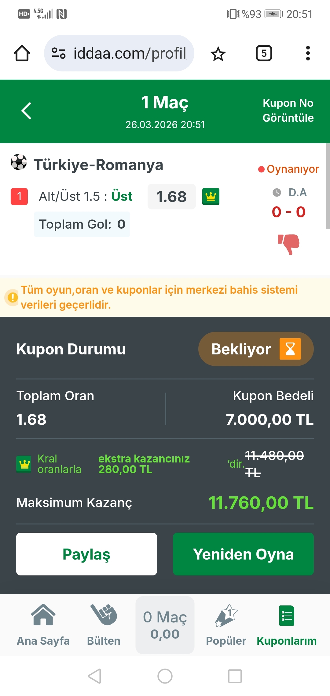12.MALAGA CF - LEGANES : BANKO: Malaga tribünlerinin o bitmek bilmeyen enerjisi ve takımlarına olan sarsılmaz inançları, bu kritik maçta futbolcuların sahadaki en büyük itici gücü olacaktır. Leganes ise deplasmanlarda o beklenen karakteri bir türlü ortaya koyamayan, savunmada büyük açıklar veren bir görüntüde. Malaganın oyun zekası ve rakip yarı alandaki o bitmek bilmeyen presi, Leganesin oyun kurmasını engelleyecek ve onları hataya zorlayacaktır. Ev sahibinin bu maçı kazanarak üst sıralardaki yerini perçinlemesini bekliyorum. Tecrübem bana bu limanda fırtına kopmayacağını, gemimizin sağ salim yanaşacağını fısıldıyor. Beşinci ve son banko mühürümüz budur...