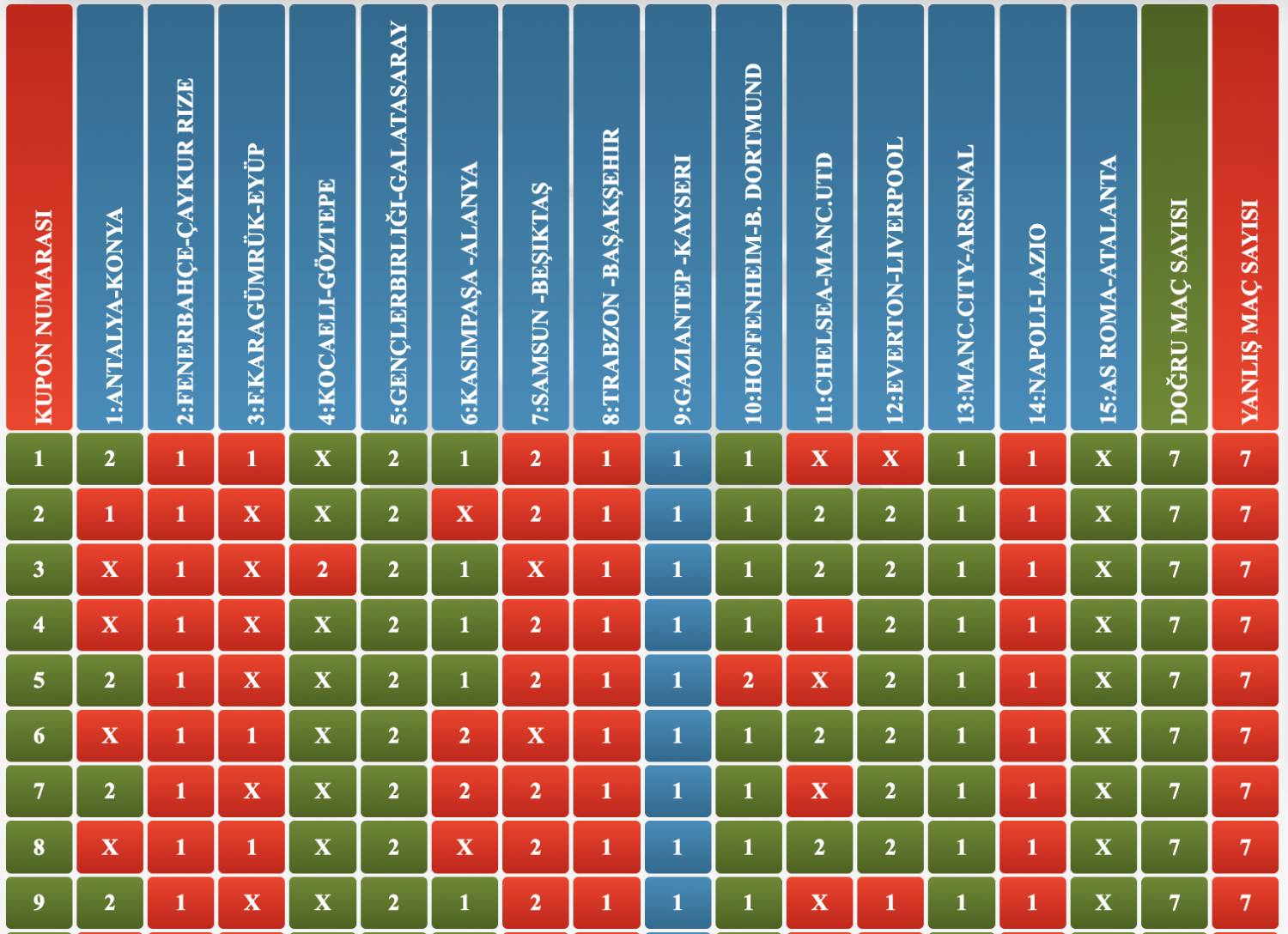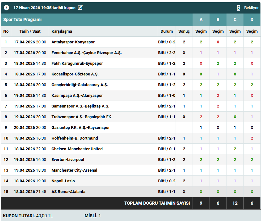 yatanların 5 tanesi benim tercihim, 3 tanesi tek 2 tanesi çift olacak şekilde. onlar gelseymiş 12, yarınki maç da gelse 13 verecekmiş. ben memnunum bu formülden. öyle analizle takiple yapılacak iş değil... şans çok ama çok büyük bir etken. haftaya 2-3 tane tek atıp kalanını şansa bırakıp bir de filtre uygularım.